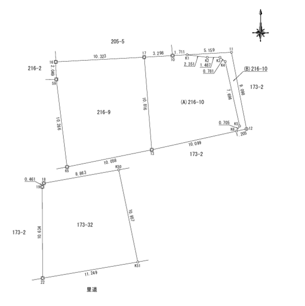 | 備考 | 本物件は、建築可能部分(本小路216-6および216-10の2筆)215.54㎡(約65.2坪)と、別途南側道路を挟んだ敷地(173-32)110.67㎡(約33.48坪)を同時にお引渡しします。 尚、173-32については建築基準法上の道路ではない道路のみの接道となるため、建築不可の土地となります。 |